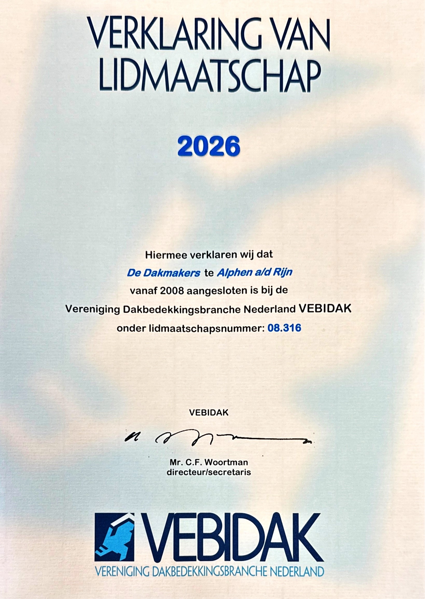 Als erkend lid van Vebidak werken wij volgens de strengste kwaliteitsnormen binnen de Nederlandse dakbranche. Dit betekent hoogwaardige materialen, vakkundige verwerking en aantoonbare garanties op al onze werkzaamheden. Onze klanten kunnen rekenen op duurzame, veilige en toekomstbestendige dakoplossingen.
